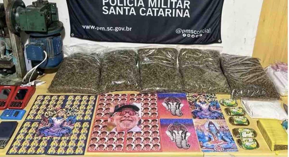 A PM revelou que na casa do traficante havia 7 mil comprimidos de LSD estampados com o rosto de Lula. No local também foram encontrados quatro quilos de skunk, conhecido como supermaconha, além de 300 gramas de cocaína e 400 gramas de maconha, prensas, balanças de precisão e máquinas de cartão de crédito para cobrar pelas drogas.