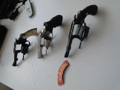 Policiais Militares em rondas pelo bairro Cristo Rei, receberam uma denuncia que no velório do Moacir costa lima vitima de homicídio na data de ontem (05-12), informações que os amigos e parentes da vítima estariam armados, deslocando até o local mencionado na rua Frei Salvador, a guarnição ao chegar ao local avistou alguns indivíduos que ao verem que a viatura se aproximava adentraram em um veículo Astra cor Cinza de placa JYW-0036, vindo a sair do local em alta velocidade, onde os policiais militares fizeram o acompanhamento do veículo no intuito de aborda-ló e solicitando apoio das demais viaturas da área, onde conseguiram abordar o veículo nas proximidades da Av. da Feb, foi localizado 01 revolver cal. 38 com seis munições intactas, 01 revolver cal. 32 com seis munições intactas e 01 revolver cal. 357 com cinco munições intactas e uma munição deflagrada.
