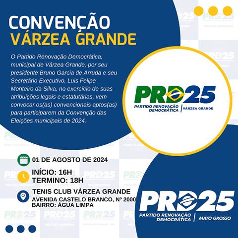 A Convenção acontece na próxima quinta-feira, das 16:00 as 18:00 horas, no Tênis Clube de Várzea Grande, em frente a prefeitura da cidade.