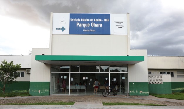 A foto principal mostra a fachada da UBS Parque Ohara. O prédio, de um pavimento, é pintado nas cores branca e verde. Na frente há um letreiro azul, com letras brancas indicando o nome da unidade.