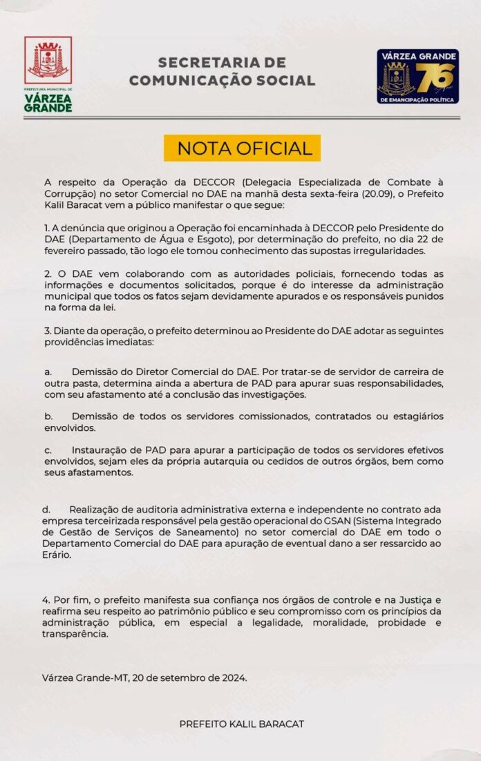 Cidade Prefeitura de Várzea Grande publica Nota de esclarecimento referente a Operação Gota D’agua Por Parmenas Alt - 20 de setembro de 2024 0 130 FacebookTwitter