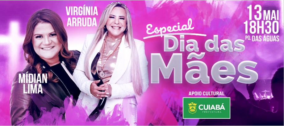 A Prefeitura de Cuiabá, por meio da Secretaria Municipal de Cultura, Esporte e Lazer, realiza no próximo sábado (13), a partir das 18h30, no Parque das Águas, um Evento Gospel em comemoração ao Dia das Mães, celebrado no próximo domingo (14). A cantora Mídian Lima e a bispa Virgínia Arruda, duas grandes personalidades do cenário nacional do mundo evangélico, serão as atrações. Será uma celebração de muita fé e louvor e integra as celebrações aos 304 anos de Cuiabá.