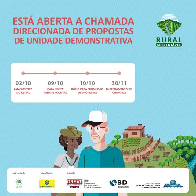 O Banco Interamericano de Desenvolvimento (BID), o Ministério da Agricultura, Pecuária e Abastecimento (MAPA) e a Embaixada Britânica, com apoio do Instituto Brasileiro de Sustentabilidade e Desenvolvimento (IABS), lançaram,no último dia 02 de outubro, chamada complementar de propostas direcionada para produtores rurais de 44 municípios brasileiros que queiram transformar suas propriedades em Unidades Demonstrativas (UDs) do Projeto Rural Sustentável(PRS).