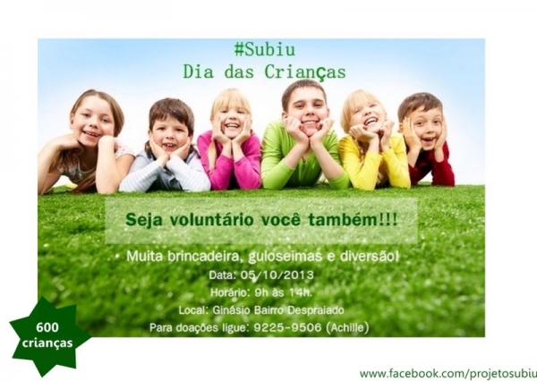 Em Cuiabá o projeto solidário chamado “Subiu”, vai realizar um evento para comemorar o dia das crianças no Ginásio do Bairro Despraiado, neste sábado (05), à partir das 9h às 14h. A estimativa do evento é contar com a participação de 600 crianças.