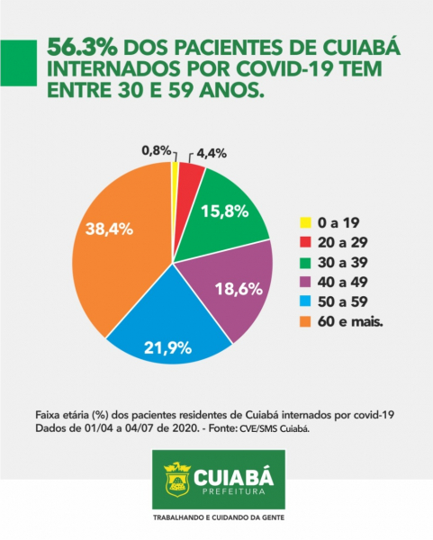 Entre os dias 1º de abril a 4 de julho desde ano, 999 pessoas residentes em Cuiabá foram internadas por Covid-19. Dessas, 56,3% têm entre 30 e 59 anos, ou seja, são adultos em idade laboral, ou seja, que precisam trabalhar e, consequentemente, têm menos condições da fazer o isolamento social. Os idosos (pessoas acima de 60 anos) representam 38,4% do total de cuiabanos internados. Os jovens (pessoas entre 20 e 29 anos) representam 4,4% dos internados e as crianças e adolescentes (de 0 a 19 anos) apenas 0,8% dos que necessitaram acessar a rede de saúde de alta complexidade.
