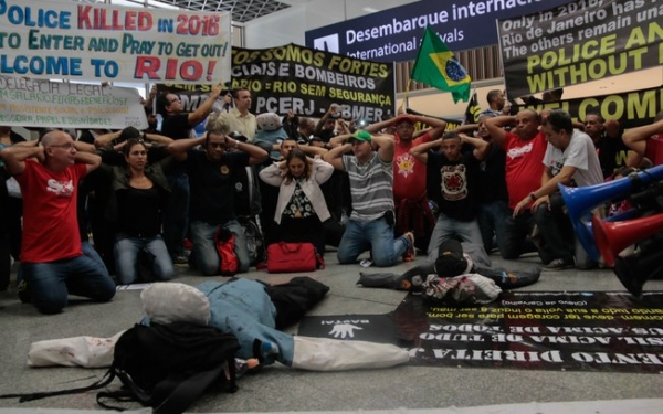 Cerca de 60 bombeiros, policiais civis e militares fazem manifestação na manhã desta segunda-feira (4) na área de desembarque do Terminal 2 do Aeroporto Internacional Antônio Carlos Jobim, conhecido como Galeão, na zona norte do Rio de Janeiro. Eles usam cartazes com frases inglês como "Bem-vindos ao inferno” e “Quem vier para o Rio não estará seguro”, escritas em inglês.