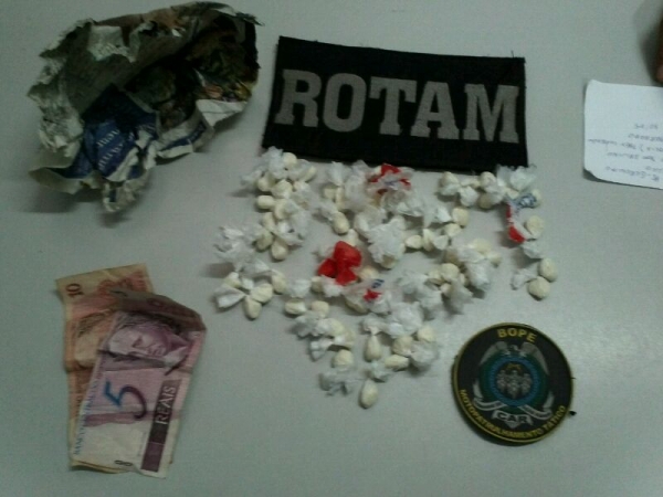 Os PMs em rondas na região conhecida como Aldeia, na rua Padre Gerônimo Botelho, próximo ao córrego, avistaram o suspeito Júlio Cézar que se encontrava as margens do córrego e ao se aproximar para realizar a abordagem o mesmo jogou uma sacola no chão, ao ser verificado na sacola tratava-se de 67 trouxinhas de substância análoga a cocaína, amarradas uma a outra.