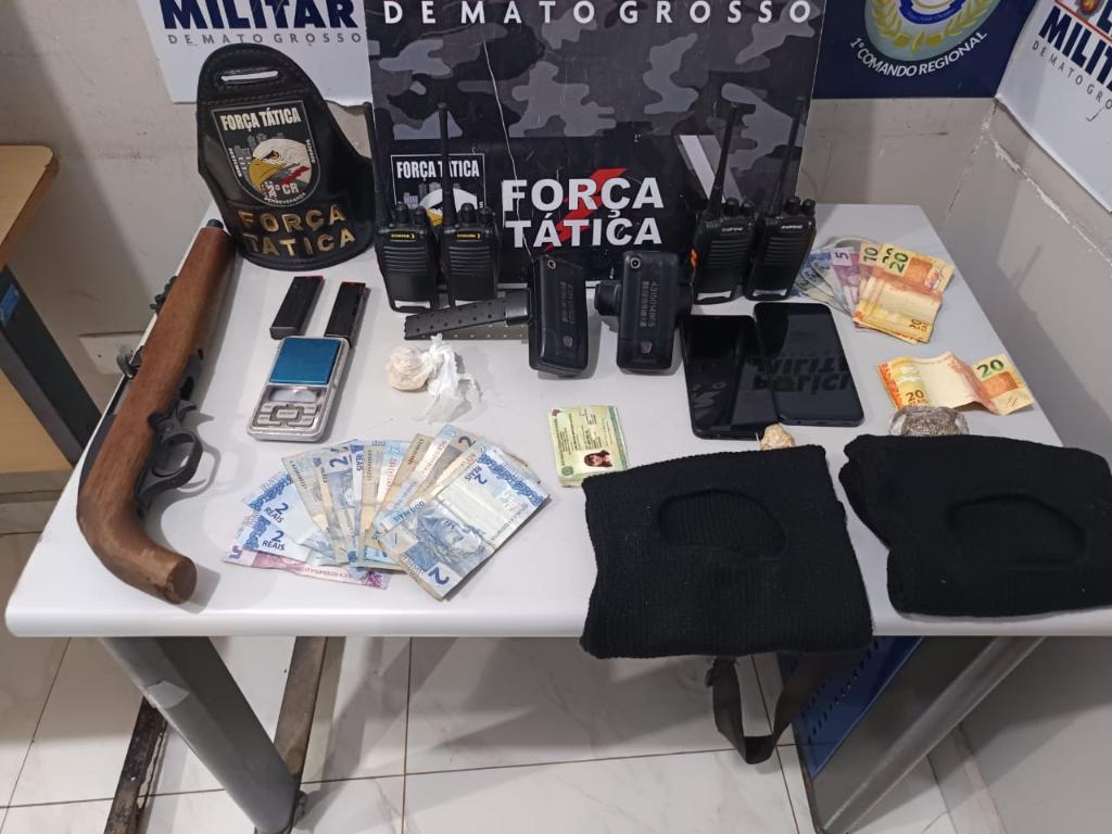 Policiais militares da Força Tática do 2º Comando Regional prenderam quatro homens e uma mulher, suspeitos de integrarem uma facção criminosa, em Cuiabá. Na ação, foram apreendidos uma espingarda calibre .22, dois carregadores de pistola, quatro rádios comunicadores, duas balaclavas, duas tornozeleiras rompidas e algumas porções de entorpecentes, entre maconha e pasta base de cocaína.