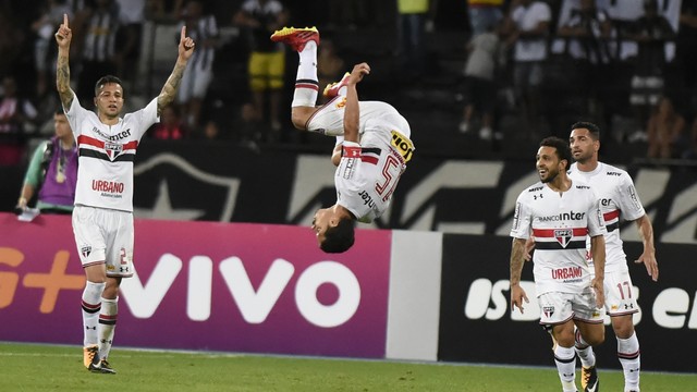Botafogo e São Paulo certamente fizeram neste sábado, no Engenhão, no Rio de Janeiro, um dos melhores jogos do Brasileirão. O duelo terminou com uma vitória épica do Tricolor, de virada, por 4 a 3, com um gol de Cueva, um de Hernanes e dois de Marcos Guilherme. O time carioca já tinha conquistado uma virada por 3 a 1 depois de ter saído perdendo, com dois gols de Marcos Vinícius e um de Guilherme. Mas o time paulista foi valente, não desistiu e conquistou o primeiro triunfo fora.