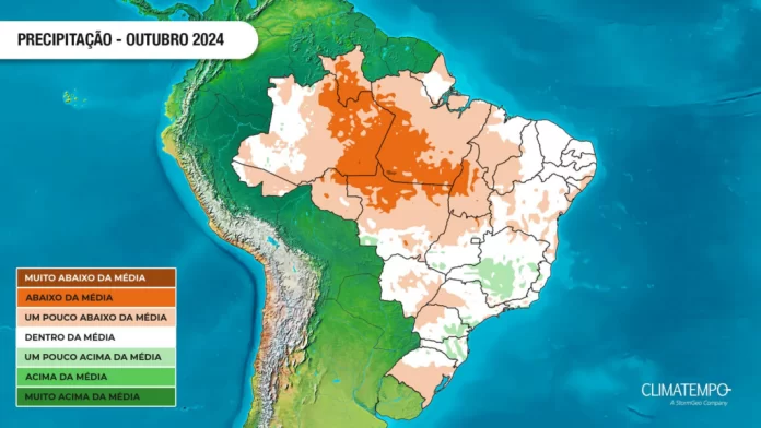 As chuvas de outubro devem ser escassas na maior parte do Brasil. A previsão indica precipitações abaixo da média no Centro-Oeste, Norte e parte do Nordeste (áreas em tom de marrom no mapa), sugerindo uma seca mais acentuada.