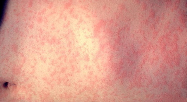 De acordo com a Opas, o primeiro sinal da doença é febre alta, podendo haver secreções no nariz, tosse, olhos vermelhos e aquosos. Pequenas manchas brancas dentro das bochechas também podem se desenvolver no estágio inicial.
