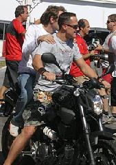 O alemão Michael Schumacher pilotou uma moto no kartódromo de Florianópolis, na tarde desta sexta-feira. Ele chegou de helicóptero ao local, onde acompanhou o sorteio que definiu os carros e as equipes dos 24 pilotos que correrão de kart durante o Desafio Internacional das Estrelas, no próximo domingo.