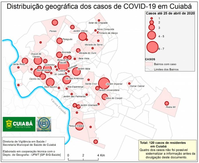 Observa-se ampliação da distribuição geográfica dos casos, tendo em vista que há uma semana havia 49 bairros atingidos e em 25 de abril foram 55, com maior número de casos nos bairros Morada da Serra (8), Centro (6), Jardim Imperial (6), Bosque da Saúde (6), Jardim das Américas (5), Jardim Itália (5), Altos do Coxipó (4), Dom Aquino (4), Duque de Caxias (4), Goiabeiras (4) e Parque Atalaia (4).