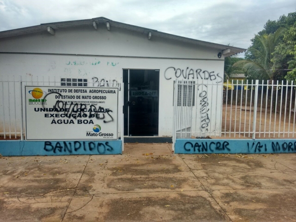A sede do Instituto de Defesa Agropecuária do Estado de Mato Grosso (INDEA-MT), em Água Boa, cidade localizada a 730 km de Cuiabá, amanheceu pichada nesta terça-feira (24). Covardes, bandidos, corruptos e câncerforam as palavras escritas na fachada da unidade. A descoberta aconteceu hoje pela manhã pelos servidores ao chegarem para trabalhar. A Polícia Militar esteve no local e registrou a ocorrência. Ninguém foi preso. A Polícia Civil segue com as investigações.