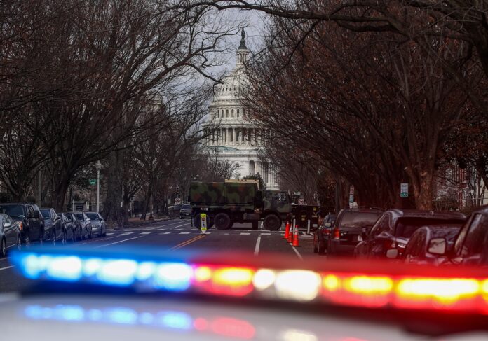 WASHINGTON, D.C., USA - JANUARY 18, 2021: A military vehicle is pictured in a street near the US Capitol Building. Washington, D.C., tightens security measures ahead of the inauguration of US President-elect Joe Biden scheduled for January 20. Yegor Aleyev/TASS.No use Russia.