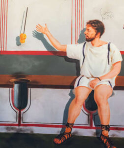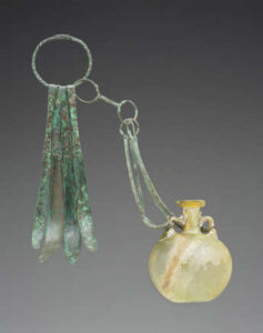 Com o óleo devidamente espalhado, o estágio final do ritual envolvia a raspagem da substância usando um instrumento de bronze conhecido como estrígil. Na foto, você vê um conjunto completo com um frasco de óleo.