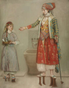 No início da história islâmica, as mulheres normalmente não frequentavam os hamams. Durante a época otomana, as mulheres eram proibidas de participar de todas as atividades sociais, inclusive de se reunir em cafeterias. Mas, por fim, as mulheres foram admitidas, embora estritamente segregadas e em horários diferentes. Na foto, uma senhora em trajes turcos com sua criada no hamam.