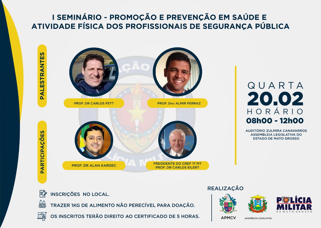 A capital de Mato Grosso irá sediar o “I Seminário – Promoção e Prevenção em Saúde e Atividade Física dos profissionais da Segurança Pública” do Estado. O evento acontece no dia 20 de fevereiro, das 08 às 12 horas, no Auditório Zulmira Canavarros, na Assembleia Legislativa (ALMT).