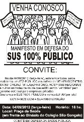 No dia 04/09/12 (terça-feira), será realizado um manifesto público, às 16h, na Praça da Saúde (em frente ao Ginásio do Colégio São Gonçalo), não só como forma de protesto, mas como meio de informar a população de Mato Grosso sobre as consequências nefastas da mudança de gestão – da pública para a inserção das OSS’s (Organizações Sociais da Saúde).
