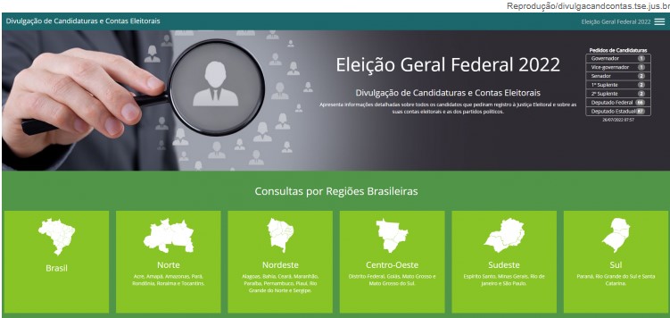 O DivulgaCand traz as candidaturas registradas em todo o Brasil para as eleições de 2022. Como o prazo para as convenções partidárias ainda segue até o dia 5 de agosto e, após, os partidos ainda têm até 15 de agosto para fazer os registros das candidaturas, os nomes vão surgindo aos poucos na plataforma até lá. Até o final da plataforma da última segunda-feira, 25, havia 36 candidatos mobilizados, nenhum da corrida presidencial, tampouco candidatos das regiões Sul e Sudeste. Qualquer pessoa pode acessar o sistema no portal do Tribunal Superior Eleitoral (TSE) sem necessidade de cadastro ou login. O objetivo da plataforma é fornecer mais informação para a população sobre os candidatos. É possível consultar, por exemplo, o grau de instrução, proposta de governo, bens declarados à Justiça Eleitoral, além de eventuais registros criminais. Dados sobre as prestações de contas de campanha também vão ser disponibilizados na plataforma a medida que os recursos forem declarados. O primeiro turno das eleições ocorrerá no dia 2 de outubro e o segundo dia será no dia 30 do mesmo mês.