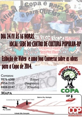 Será lançado neste sábado, 24, o Projeto “Afinal, a copa é para o quê e para quem? Processo de produção e troca de conhecimento em tempo de desiformação” que será executado pelo Comitê Popular da Copa de Cuiabá, que reúne integrantes de movimentos sociais e pesquisadores da Universidade Federal de Mato Grosso, com o objetivo de monitorar os impactos socioambientais das obras da Copa do Mundo de 2014. O lançamento será às 16h no Centro de Cultura Popular do Parque Geórgia, um dos bairros que sofrerá com os impactos das obras de mobilidade urbana.
