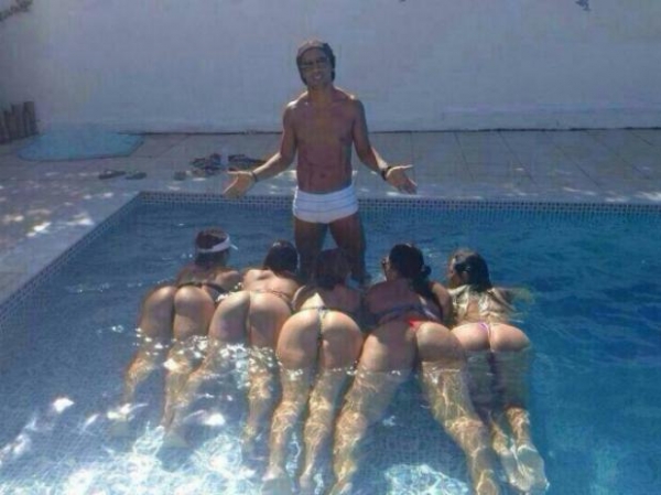 Enquanto não retorna aos treinamentos no Atlético-MG, Ronaldinho aproveita as férias. Nos últimos dias, fotos do veterano jogador foram divulgadas em redes sociais. Nesta semana, inclusive, uma imagem em especial chamou a atenção: Ronaldinho foi clicado em uma piscina, com cinco mulheres "jogadas aos seus pés".