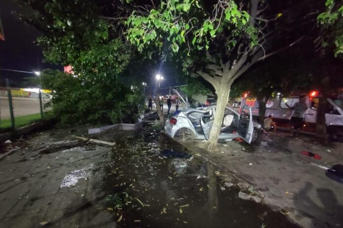 Durante fuga, homem perdeu o controle da direção atingindo um ponto de ônibus e uma árvore; veículo ficou completamente destruído