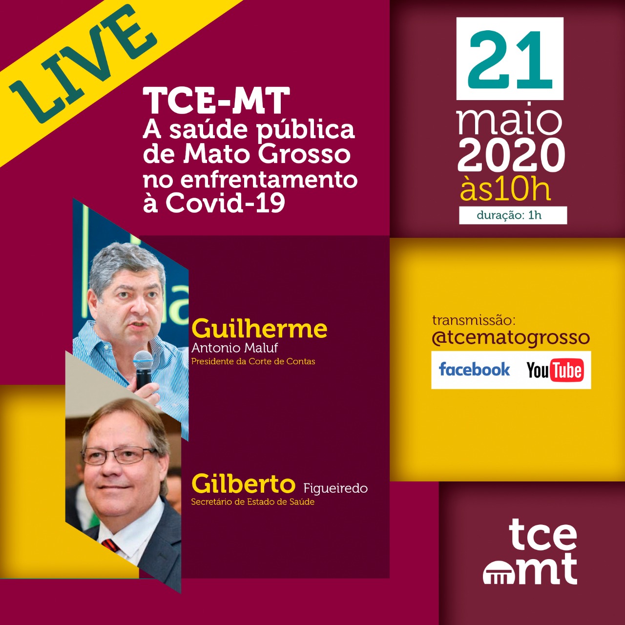 Com o tema “A saúde pública de Mato Grosso no enfrentamento à Covid-19”, o Tribunal de Contas de Mato Grosso (TCE-MT) realiza, às 10h desta quinta-feira (21), uma live com o presidente da Corte de Contas, conselheiro Guilherme Antonio Maluf, e o secretário de Estado de Saúde, Gilberto Figueiredo.