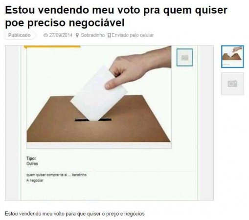 Outro eleitor do Rio de Janeiro resolveu ganhar dinheiro em cima de sua frustração. Ele diz oferecer seus votos a deputado estadual e federal por "não encontrar nenhum candidato que os mereçam".