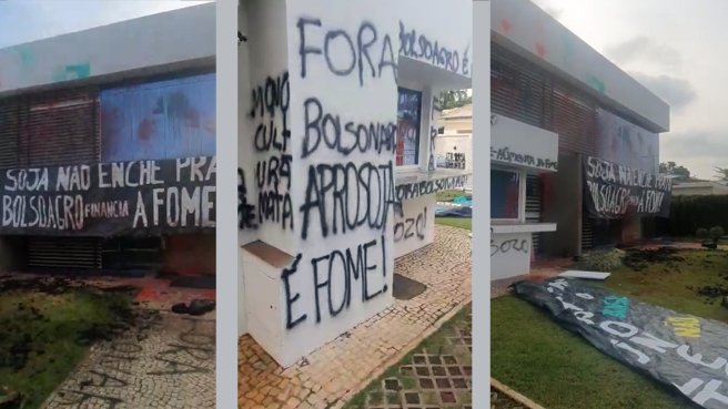 Há pichações em todo o prédio, nas partes externa e interna, com frases como “Fora Bolsonaro”, “agro é morte” e “soja não enche o prato”. Foram jogadas ainda bolas de tinta na fachada do prédio – que foi invadido pelos manifestantes – e diversas faixas foram penduradas. Todo o movimento foi registrado e divulgado nas redes sociais.