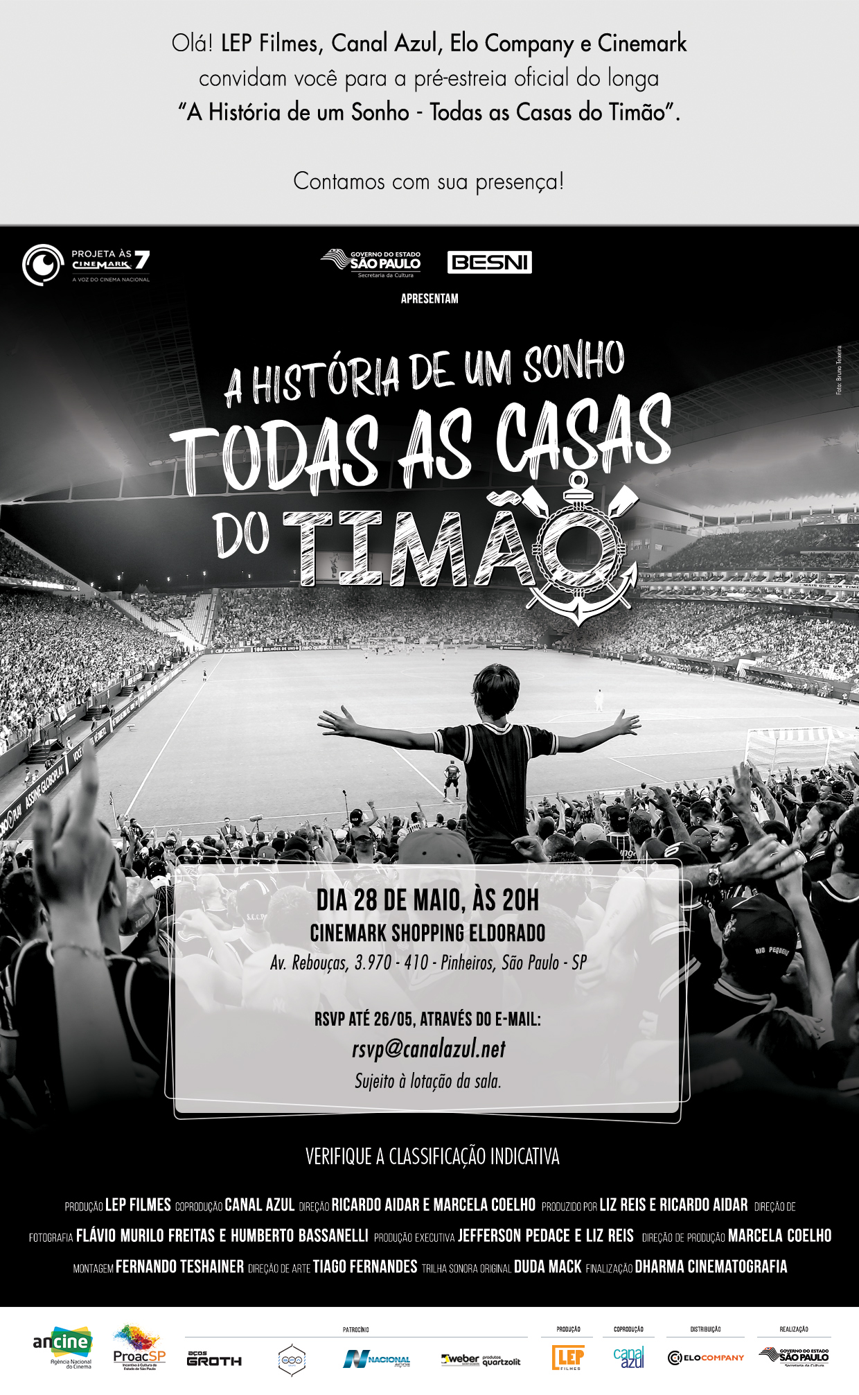 A Cinemark leva aos cinemas o documentário sobre um dos maiores times de futebol do Brasil: “A História de Um Sonho – Todas as casas do Timão”. O filme, que conta a trajetória do Corinthians até a construção da Arena Corinthians, chega às salas da Rede a partir de 6 de junho como parte da programação do Projeta às 7 – janela inédita da parceria da distribuidora Elo Company e da Cinemark que incentiva o cinema nacional. Produzido pelo Canal Azul e LEP Filmes, o longa conta com a distribuição da Elo Company e tem sessões de segunda a sexta-feira, às 19h, por ingressos a R$ 12.