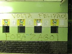 O muro das bilheterias do estádio Palestra Itália foi pichado durante a madrugada com as frases: “Fora Zago” e “Volta Felipão”. Antônio Carlos não conta com simpatia de boa parte da torcida, que sonha com o retorno do treinador gaúcho, que levou o Verdão ao título da Taça Libertadores de 1999 e hoje comanda o Bunyodkor, do Uzbequistão. A delegação alviverde retornará a São Paulo no final da manhã desta quinta-feira.