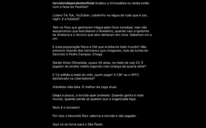Na publicação, feita no perfil oficial da instituição, a torcida organizada ressalta que, segundo a Independente, os ídolos do clube são os torcedores. Criticando os jogadores, o texto termina com: “Aqui só se torce para o São Paulo”.