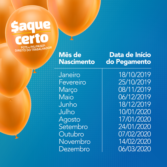 Além do saque imediato, há a modalidade do saque aniversário que prevê, a partir de abril de 2020, a possibilidade de o trabalhador retirar, anualmente, um percentual de seu saldo no FGTS. Os interessados em migrar para esse modelo precisam comunicar à Caixa a partir de 1º de outubro de 2019, nos canais a serem divulgados em fgts.caixa.gov.br.