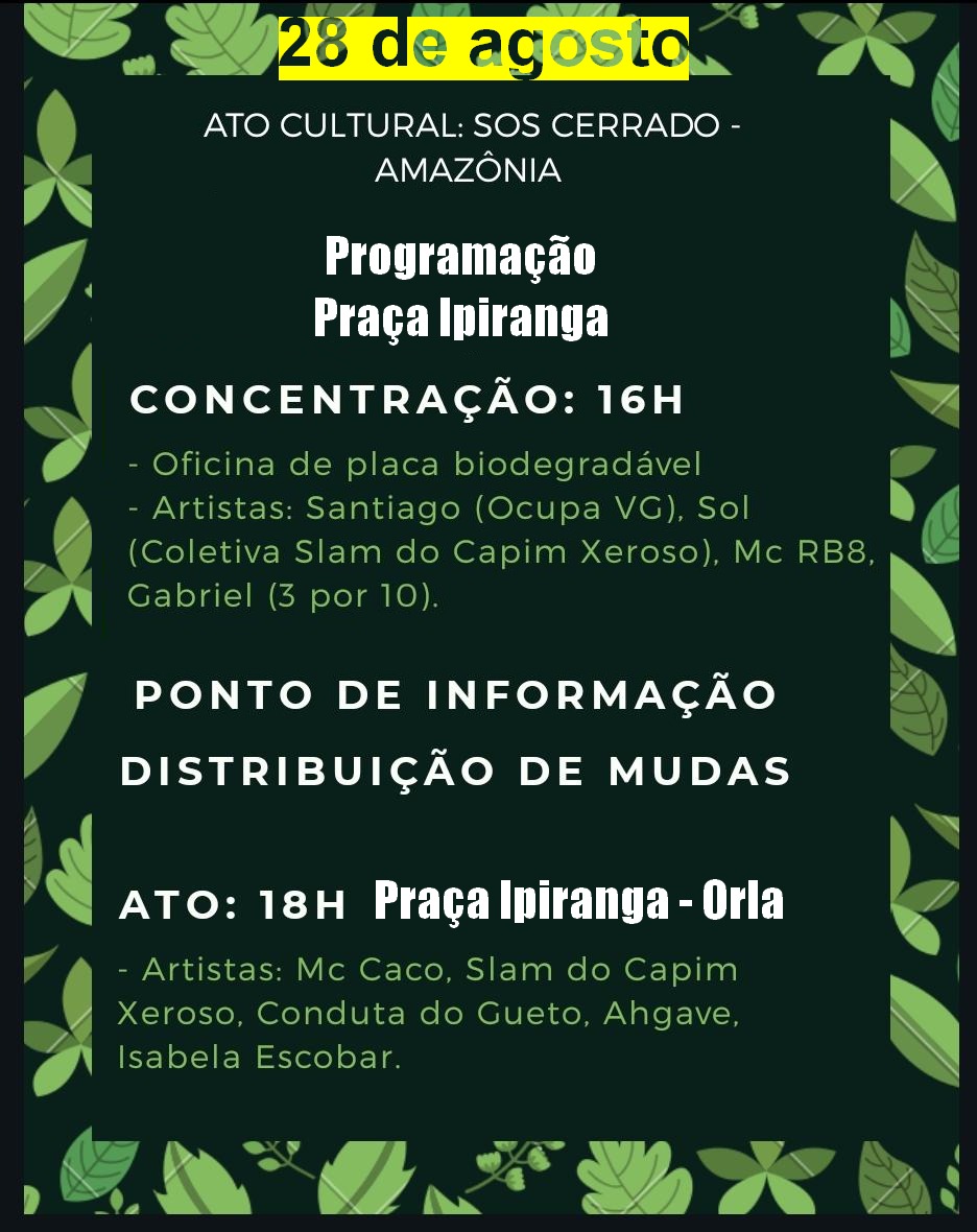 Um ato político em defesa da Amazônia, Cerrado, Pantanal, em defesa da vida, dos povos e da biodiversidade. Nós somos trabalhadores/as, estudantes, povos ancestrais, povos da cidade e artistas, lutamos pelas florestas do nosso território e contra o genocídio da vida. Nós não aceitamos que a nossa água, nosso solo, nossas riquezas, nossa agricultura sirvam meramente para exportação e obtenção de lucro para um pequeno grupo econômico.