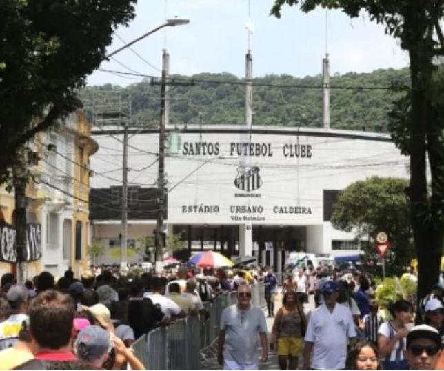 Após 24 horas de velório, o corpo de Pelé segue em cortejo pela cidade de Santos. O caixão deixou a Vila Belmiro, estádio do Santos, por volta das 10h, e seguirá pelo Canal 2, na Avenida Bernardino de Campos.
