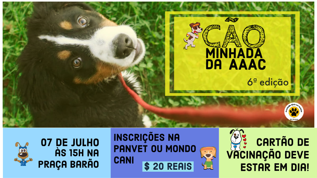 E aproveitamos para convidar a todos para participarem da 6.ª Cãominhada da AAAC, no dia 7 de julho, às 15h na Praça Barão do Rio Branco. As inscrições, de R$ 20,00, devem ser feitas na Panvet ou Mondo Cani. A Cãominhada tem o intuito de confraternizar os defensores da causa animal e arrecadar recursos para custear os tratamentos dos animais resgatados.