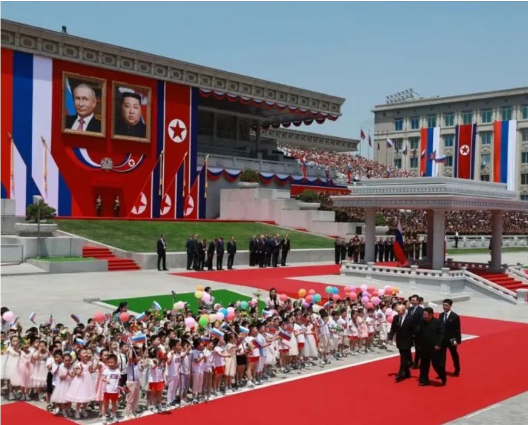 Durante a cerimônia de boas-vindas na Praça Kim Il Sung, em Pyongyang, Putin e Kim foram homenageados com uma guarda de honra e uma multidão de civis, incluindo crianças segurando balões e grandes retratos dos dois líderes. Bandeiras nacionais da Rússia e da Coreia do Norte adornavam o local, destacando a simbólica aliança entre os dois países.